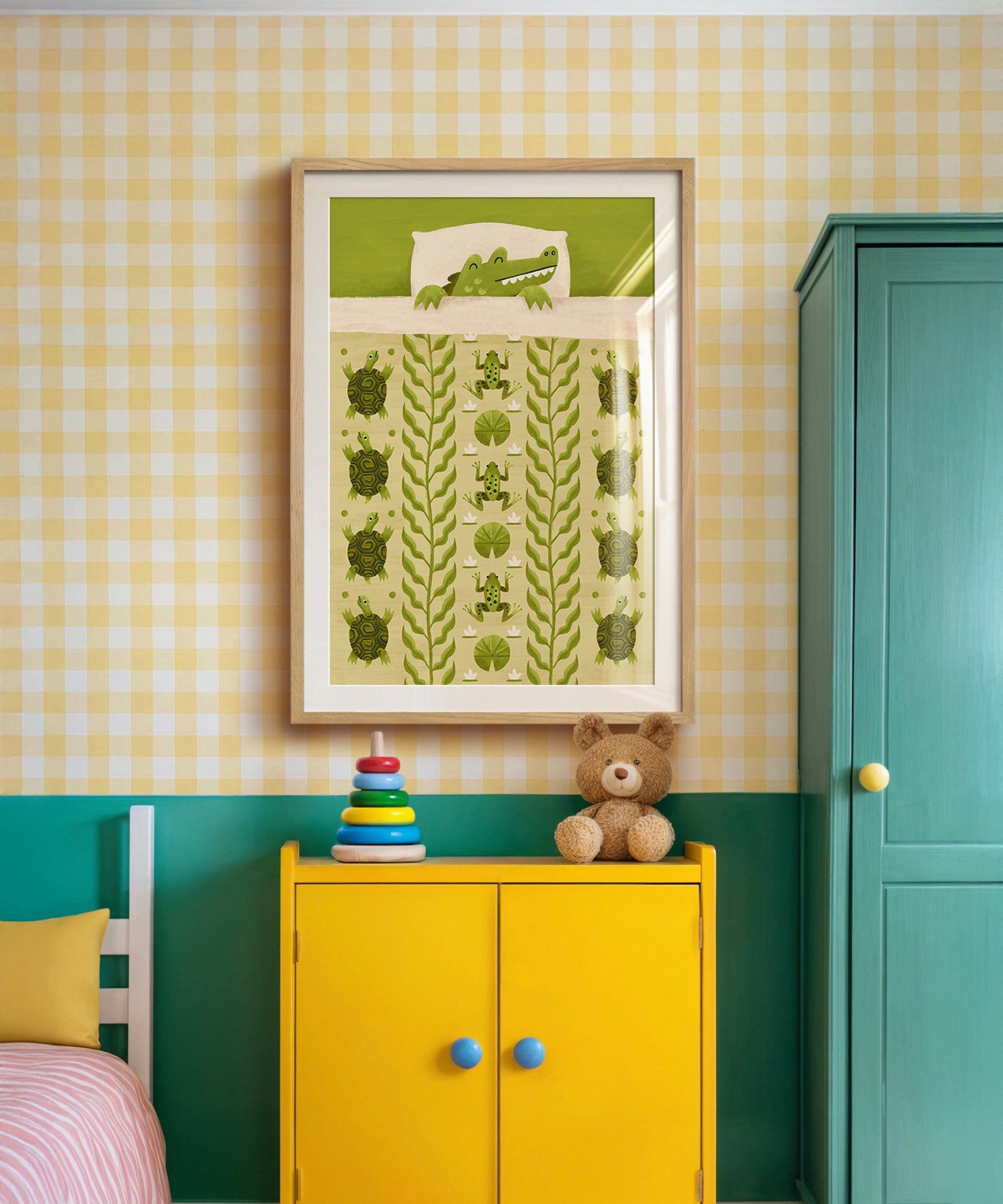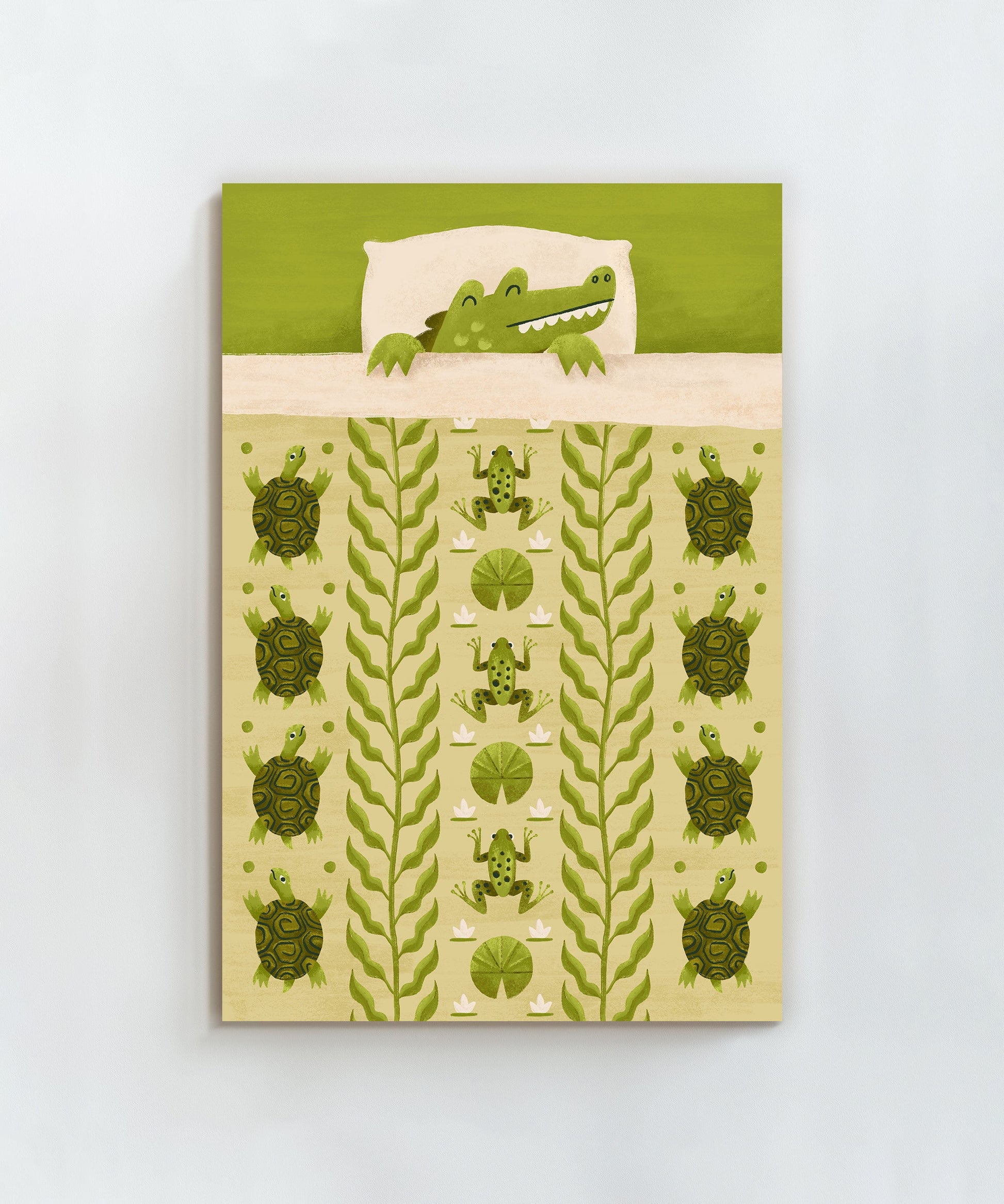 Catch some Z's with this little gator for a night filled with sweet dreams of swamp things. One of four prints in our All Tucked In Collection, this series is designed to bring your little one sweet dreams of their own. Hang this little gator solo, or pair them with one of our other sleepy animals for a duo of prints guaranteed to inspire peaceful naps and soothing night sleeps.