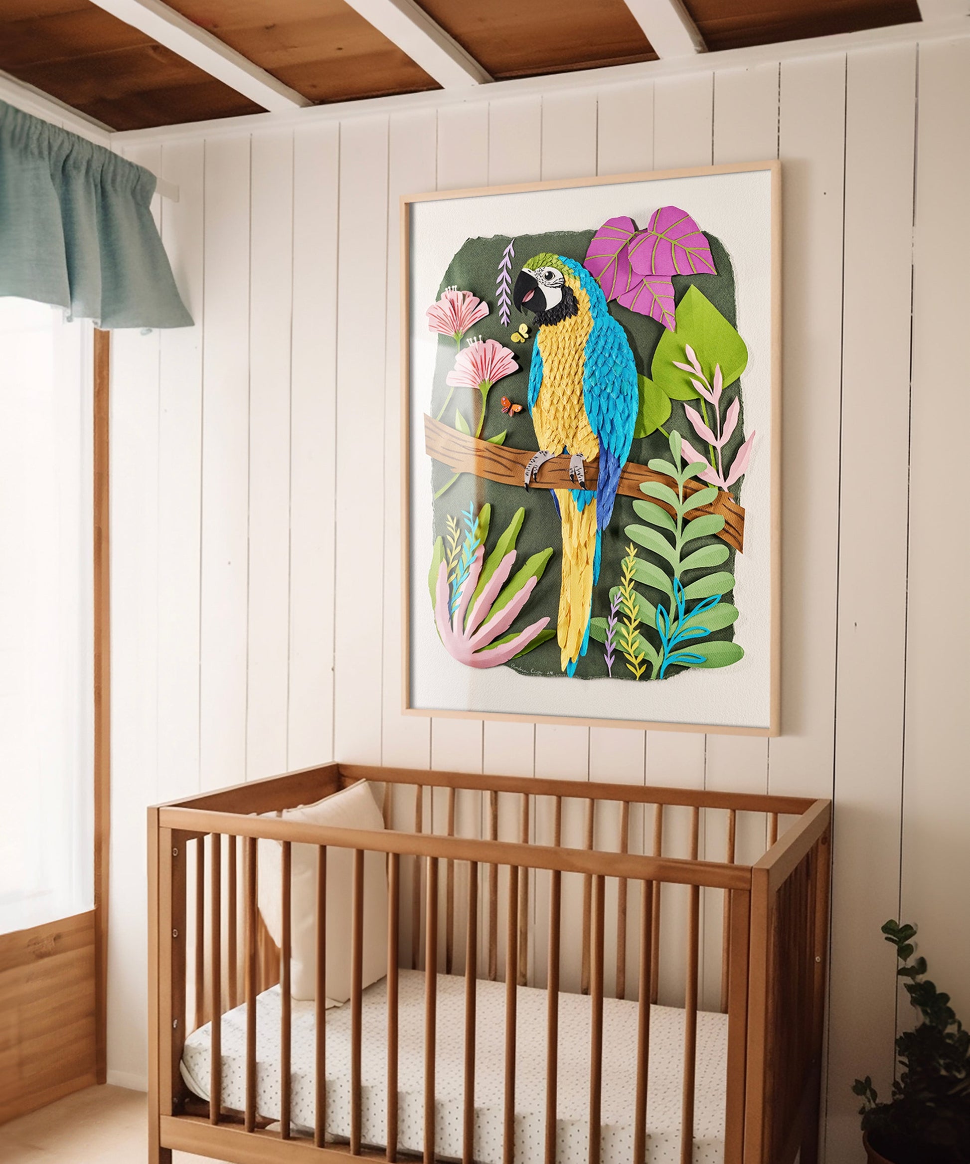This beautiful and vibrant print, featuring a blue macaw in the jungle, will bring a fun pop of color to your little one's space! Created by paper cut artist Andrea Cira, the original was made from hundreds of detailed paper pieces which are then layered on top of each other giving this piece its unique 3D appearance. The details look amazing as a large-format piece, or hang it with her Red Macaw piece to create the perfect pair!