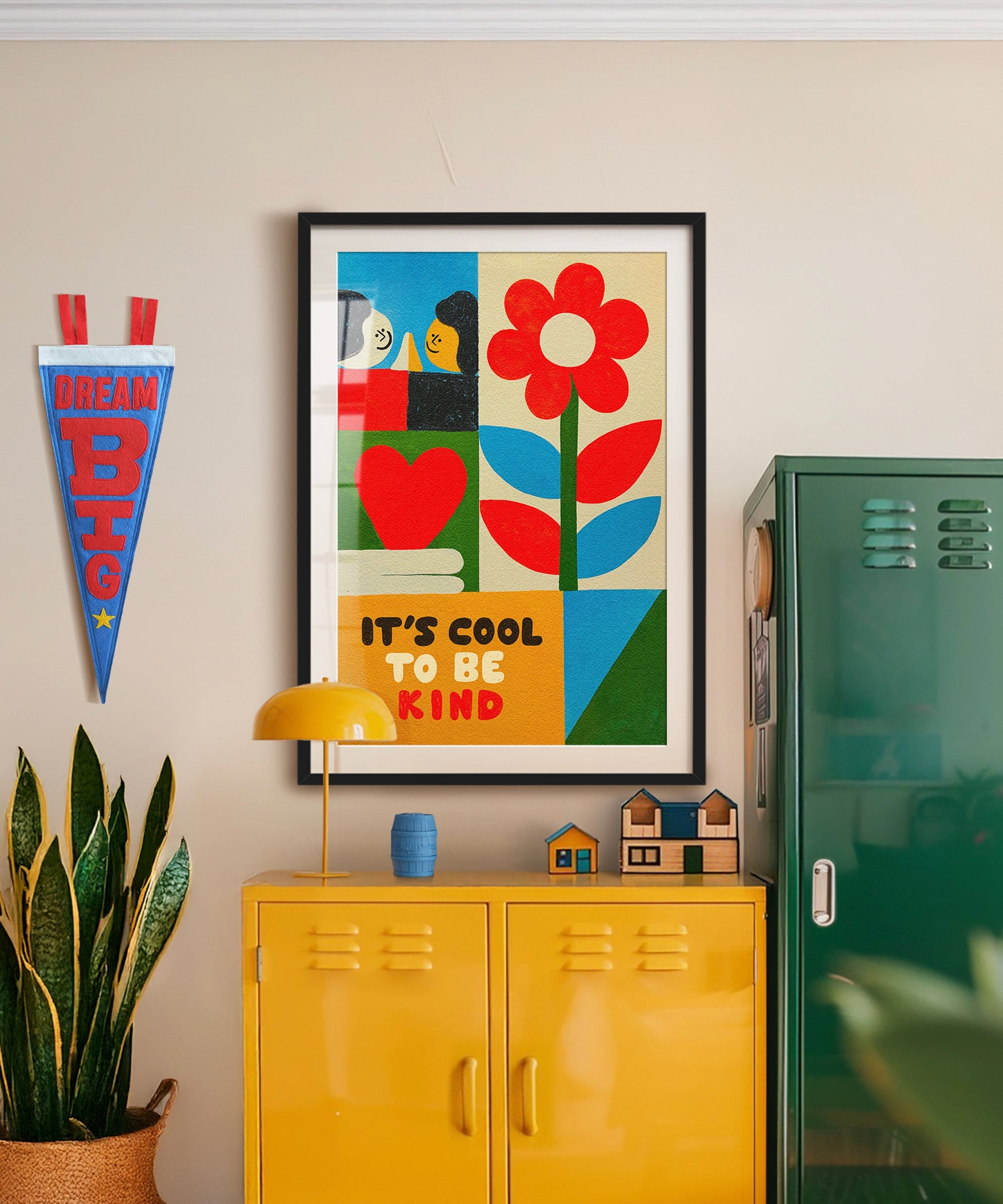 Kindness never goes out of style! Created in collaboration with illustrator Priscilla Moreno, this vibrant print is a bold reminder that “It’s Cool to Be Kind.” With cheerful colors, playful shapes, and a sweet nod to love and connection, it’s the perfect piece to brighten your little one’s room and inspire big hearts and kind souls.