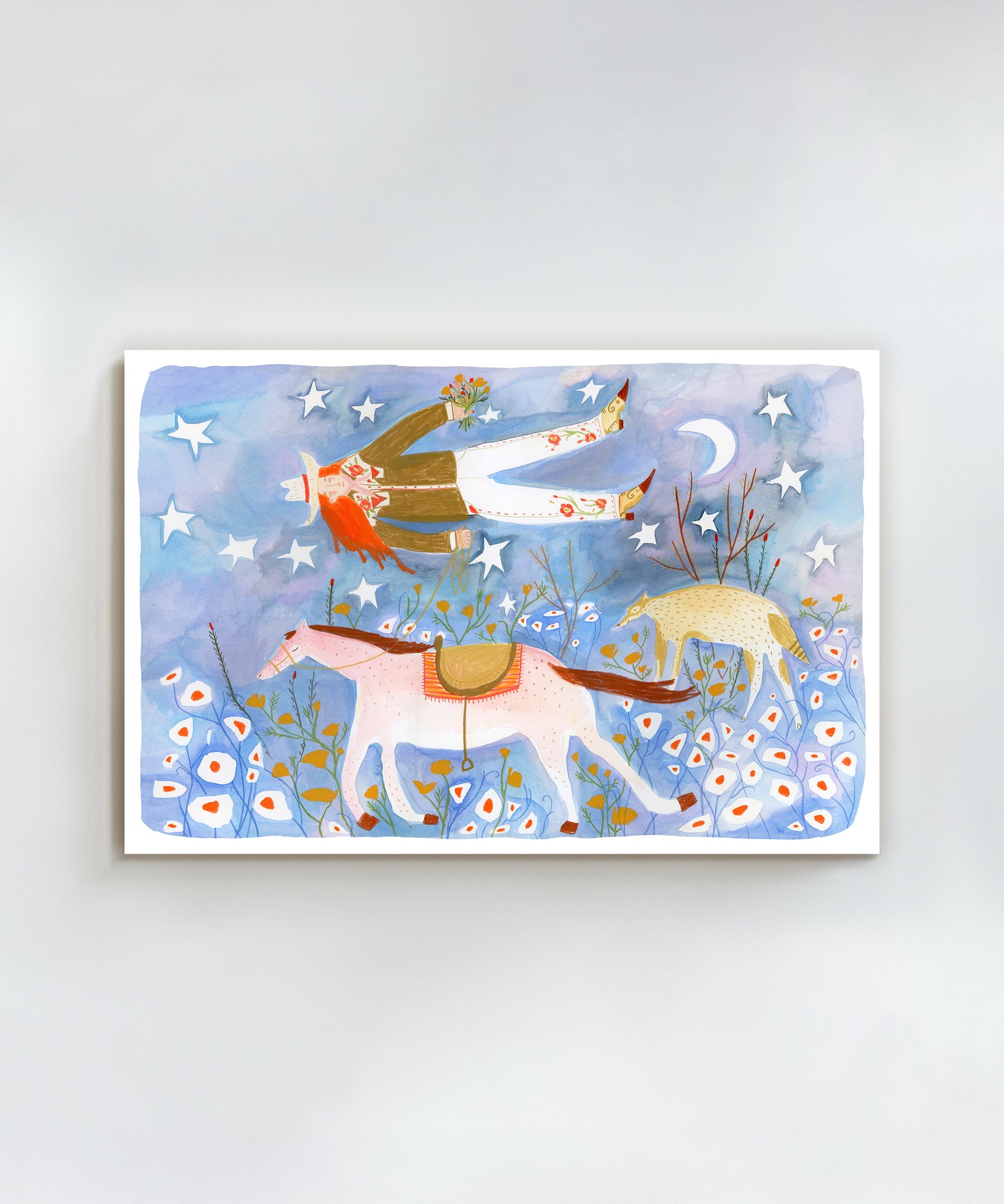 "Dream Journey" is the fitting title of this beautiful western print by Melissa Lakey. Featuring a dreaming cowgirl floating above her horse, this piece makes a marvelous match with its companion piece "Who's Dreaming Who?". With its charming aesthetic and serene hues, this print will bring a soothing presence into any little one's room.