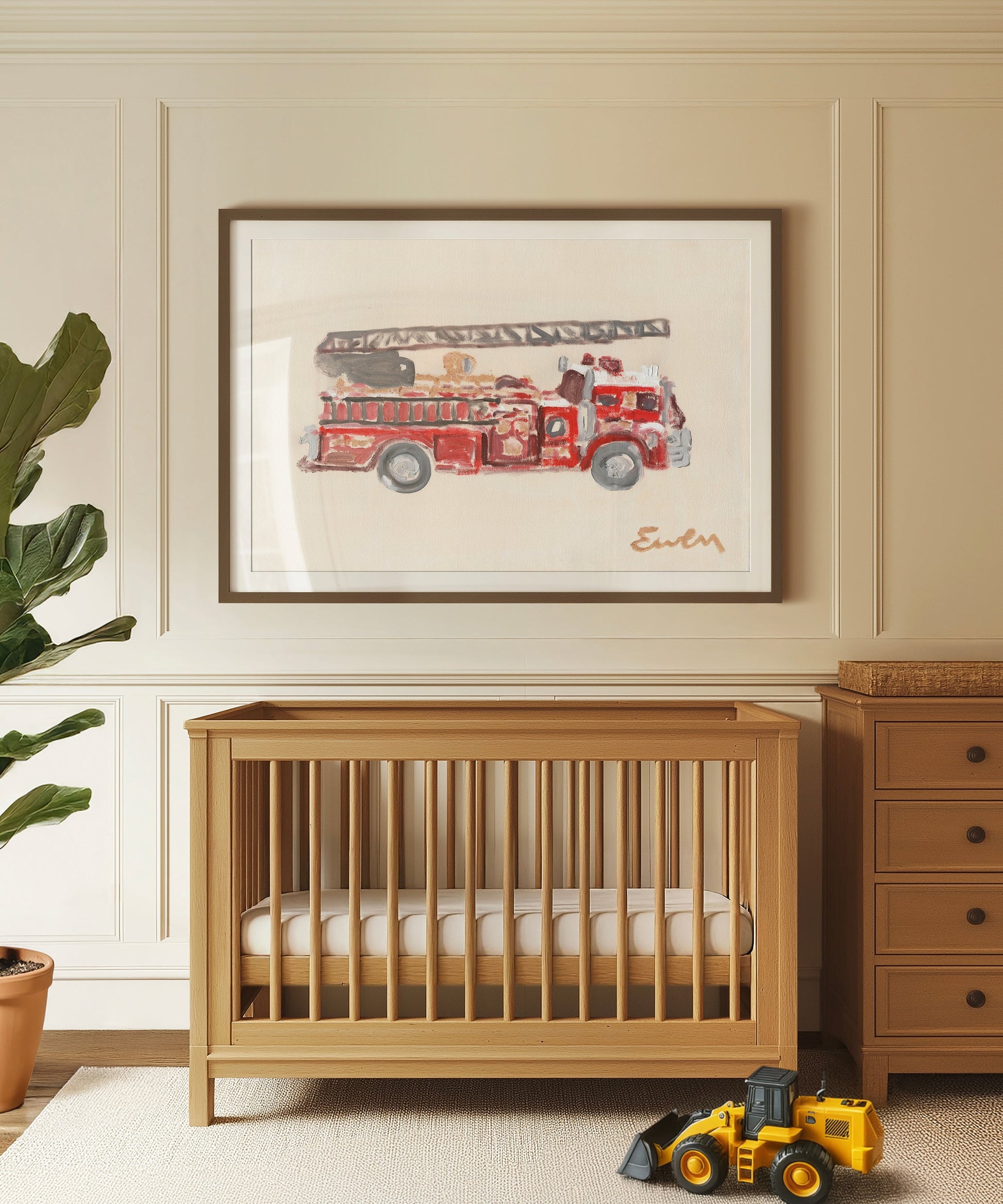 The classic red fire truck, a must-have for your big vehicle-loving little one. Captured in expert fashion by Anne-Louise Ewen, this print shines with confident and colorful brushstrokes. Originally painted in her signature minimalist style on a raw canvas, it elevates the iconic red rig into the realm of fine art. Part of her vehicle collection, this piece stands strong on its own or pairs beautifully with Ewen’s pickup or dump truck for a duo of hardworking classics.