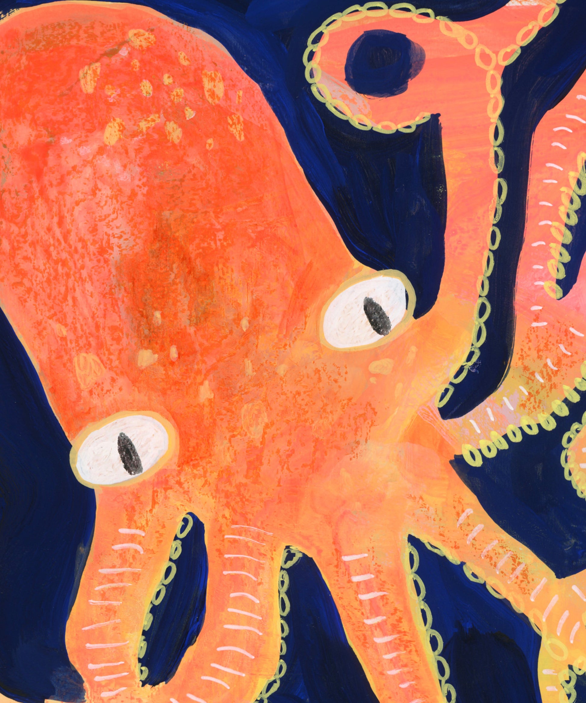 Introduce a splash of vibrant underwater wonder to your nursery with this charming "Friendly Octopus" art print by Melissa Lakey. The playful octopus, rendered in warm oranges and pinks against a rich blue background, captures the imagination and brings a serene touch to your ocean-themed space! This delightful piece is sure to bring a friendly presence to your little one's space for years to come!