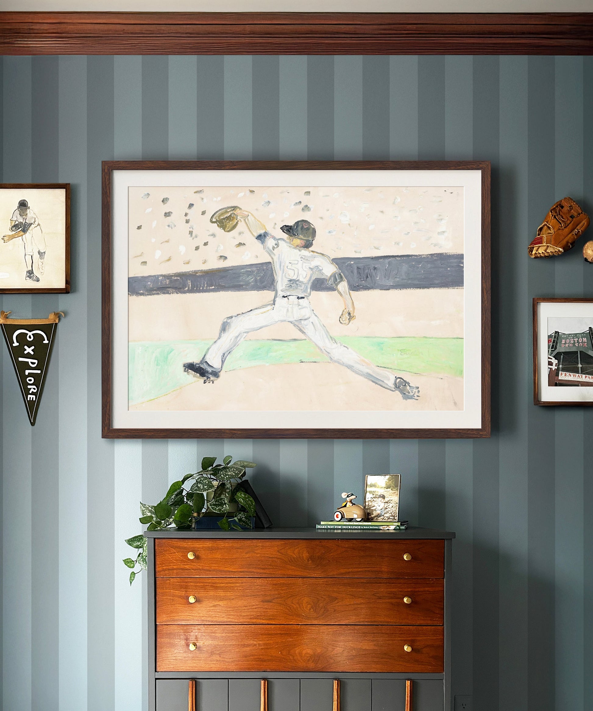 Here comes the two-seamer! In this charming print by Anne-Louise Ewen, a big-league pitcher is captured mid-motion, ready to bring the heat. Rendered in Ewen's signature minimalist style, the loose brushstrokes capture all the energy and rhythm of the game. Perfect for your future big leaguer, this piece adds a sophisticated touch to any sports or vintage-themed nursery.