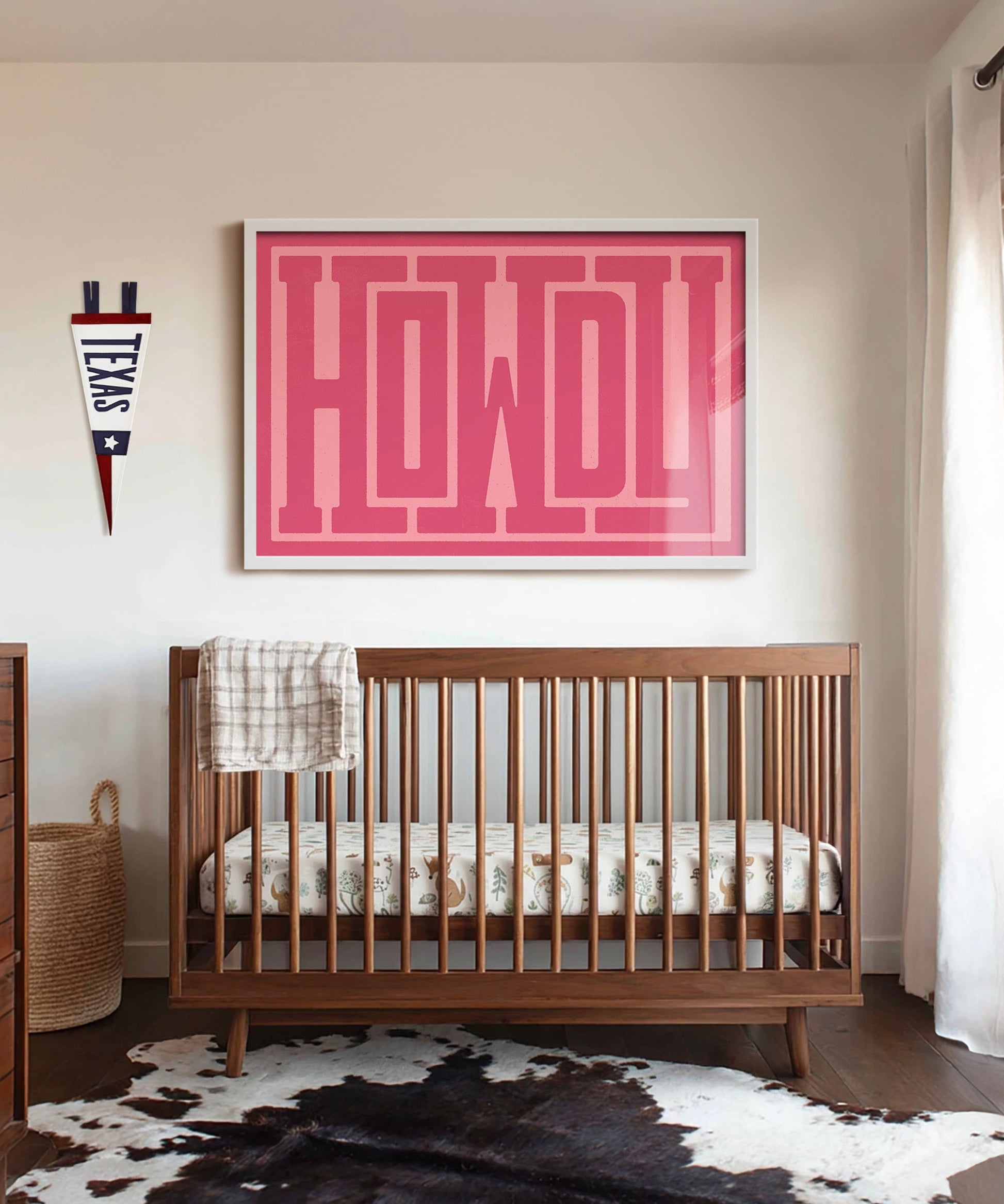 The perfect welcome to the world for your little cowgirl, our Howdy typography print makes a bold and playful statement in any western nursery. Featuring custom-designed block type, it’s western with a modern twist. Made to grow with your kiddo, it’s cute enough for the nursery and cool enough to stay up long after the diapers are gone.
