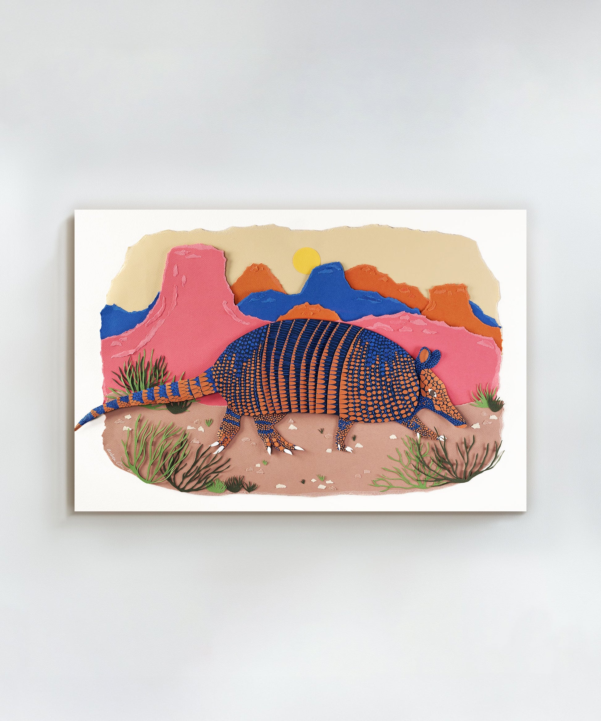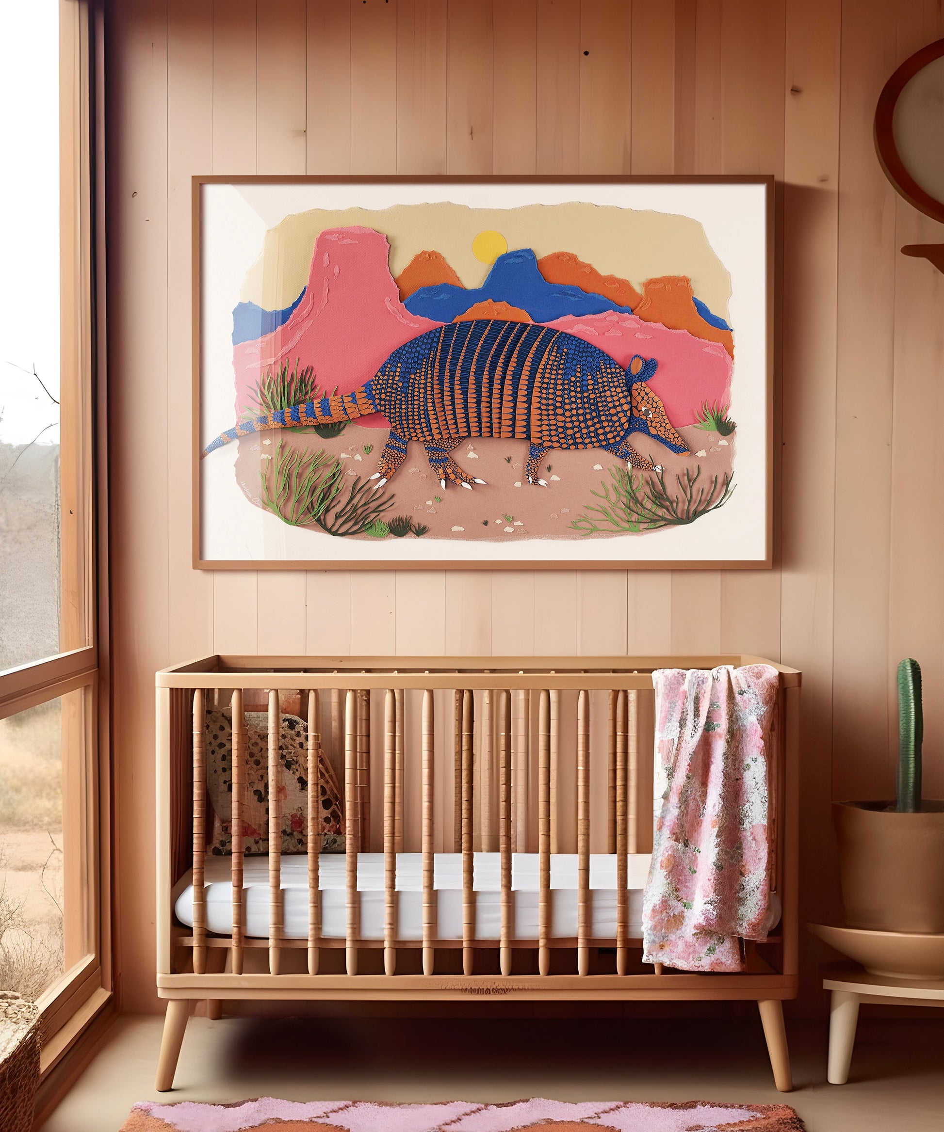 Scuttling its way through the colorful desert landscape is this incredibly detailed armadillo print by cut paper artist Andrea Cira. Made from an original created by layering hundreds of meticulously cut pieces of paper, the details in this little critter are truly a site to see. Perfect for your little one's western themed nursery or kid's room, this piece looks great solo, or paired with one of her other three cut paper desert animals!
