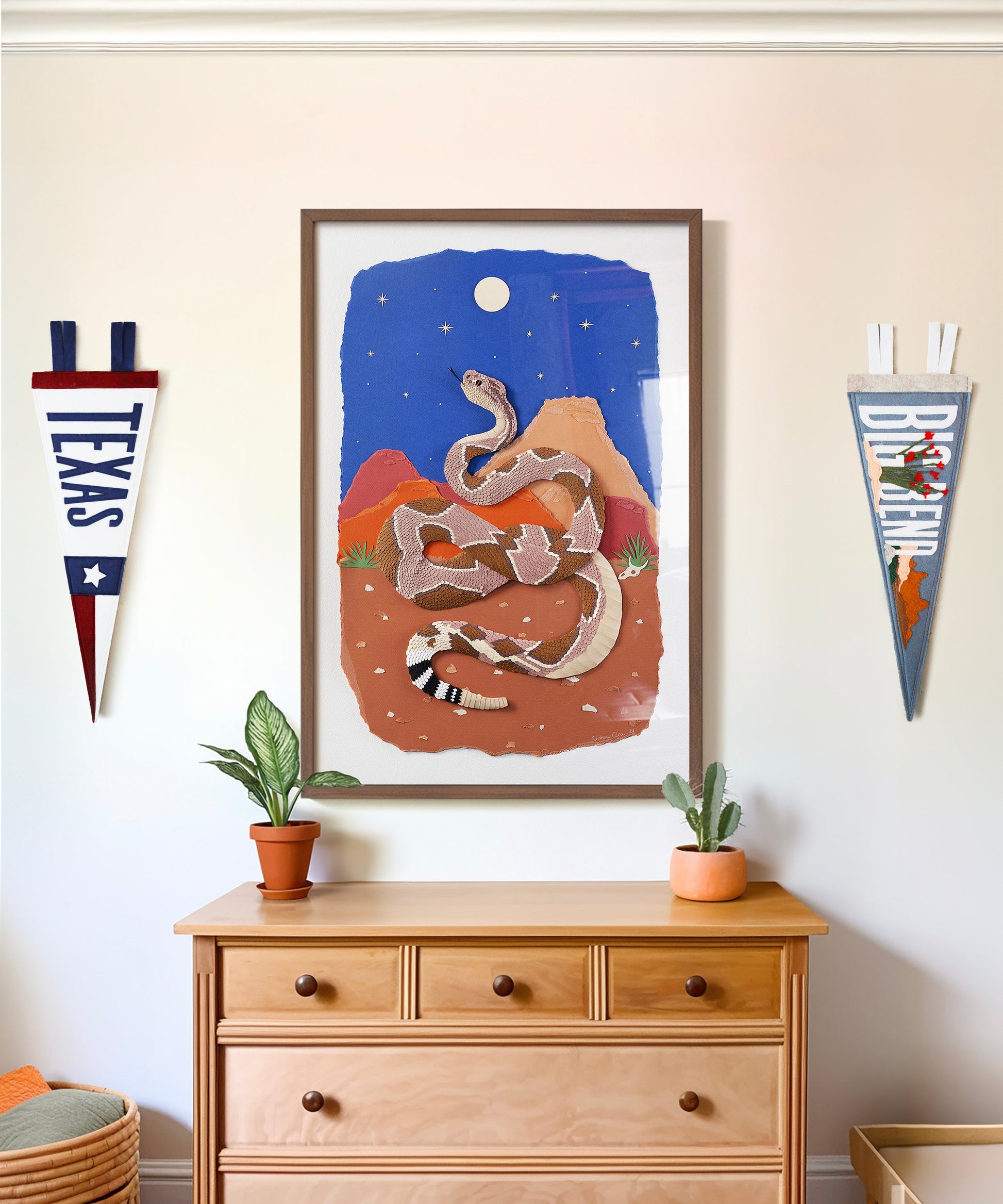 Slithering into the night is this amazing cut paper rattlesnake print by Andrea Cira. Made from an original piece that was created by layering hundreds of individually cut pieces of paper, the details in this piece are astounding. Once up close, you can see each and every scale was meticulously put into place, giving this print a 3D characteristic that makes the snake seemingly come to life.