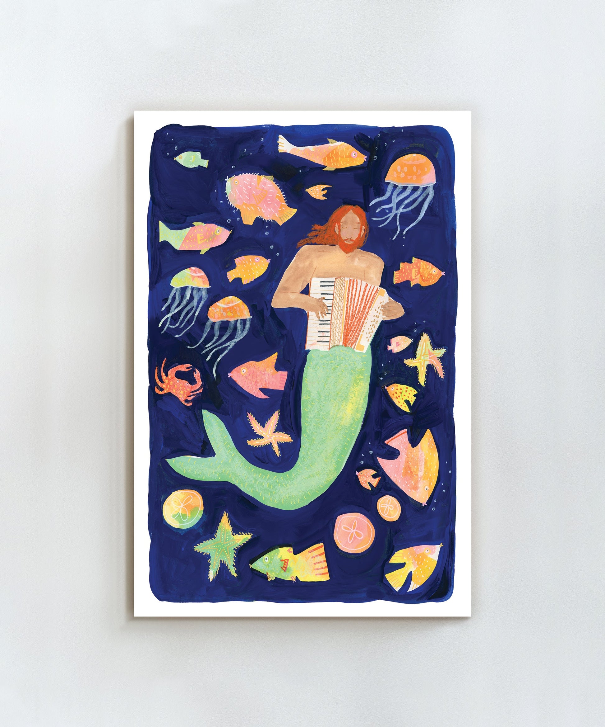Let this charming print, Sea Songs, transport you to an underwater world of whimsy and joy! With his trusty accordion, this merman lures in sea creatures just as he'll lure in those who see the print in your space. Hang him solo, or for the perfect pairing, check out Melissa Lakey's "Ocean Melody" featuring his mermaid partner.