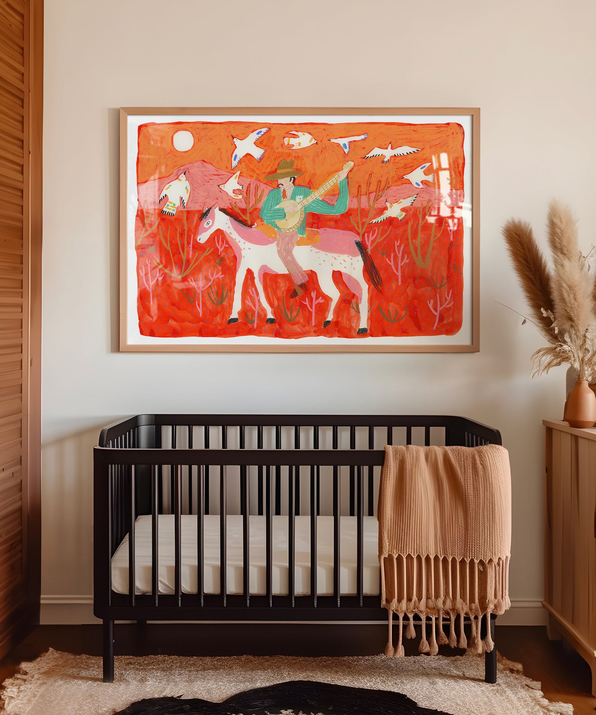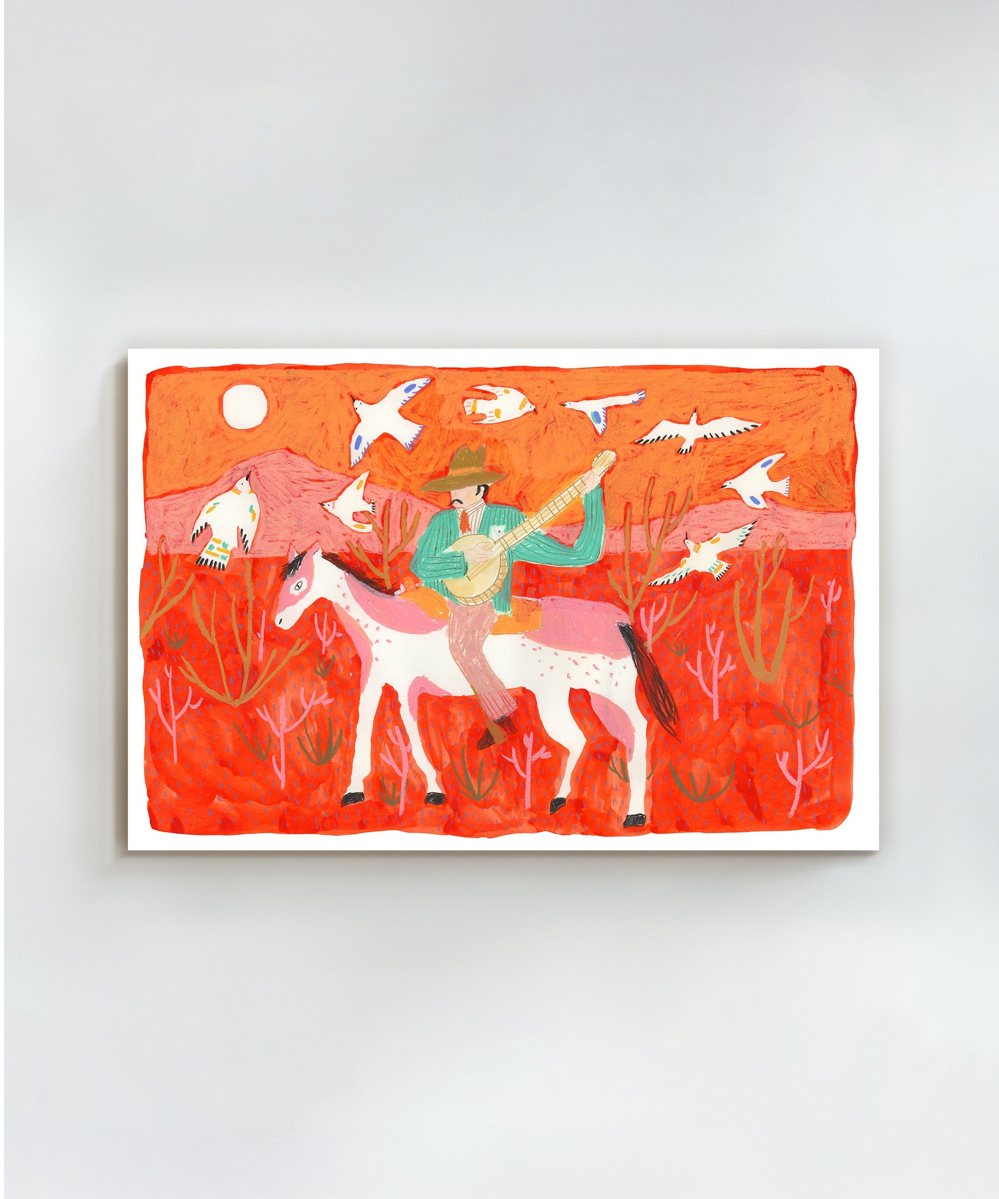 One of Melissa Lakey's greatest hits! This vibrant piece, entitled "Singing for the Birds," captivates with its color and detail. Featuring a cowboy strumming his banjo as the birds circle above, this piece is perfect for your western or music-inspired nursery or kid's room. Hang it solo, or pair it with Melissa's other cowboy and cowgirl designs for a beautiful collection of color.