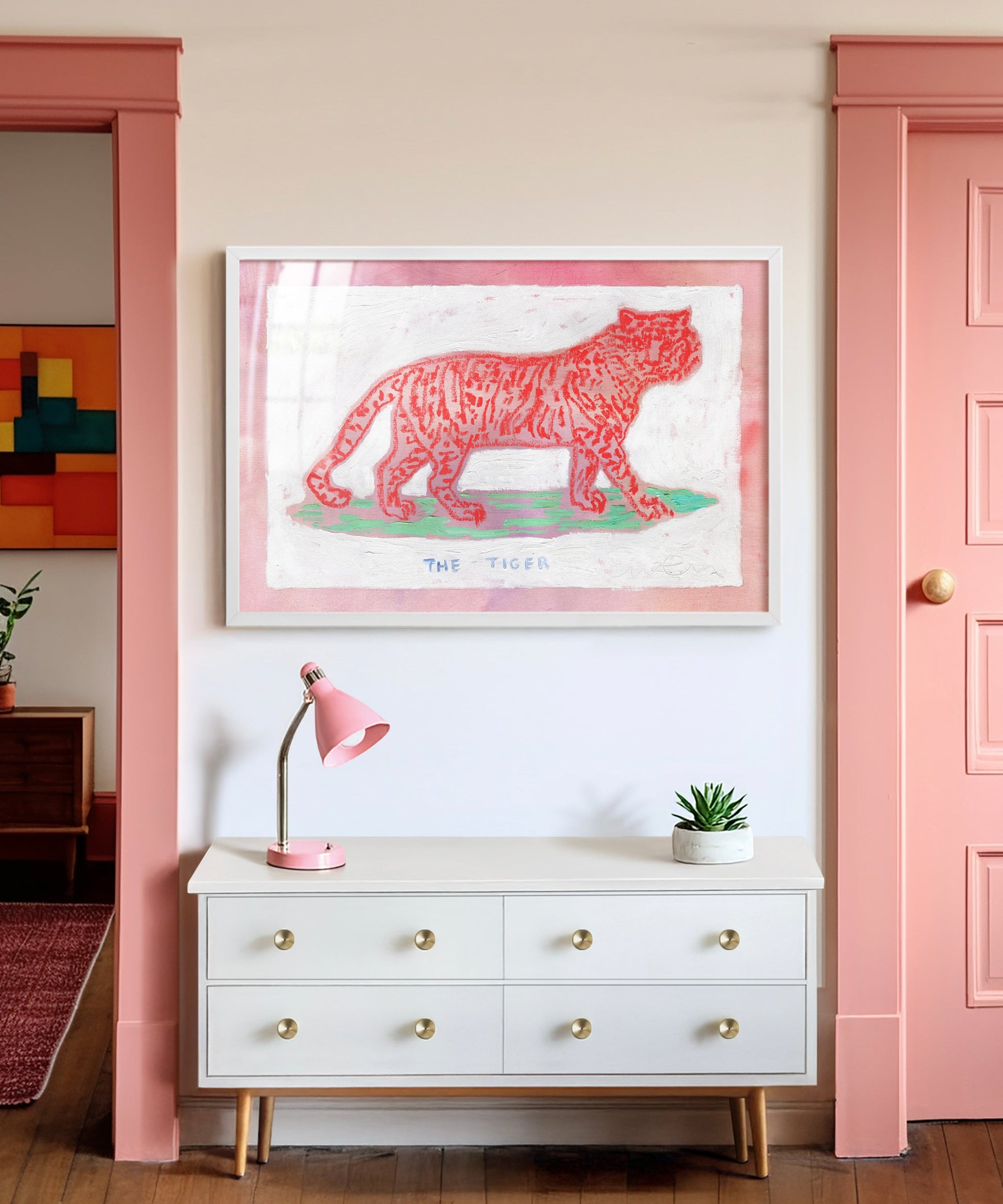In this whimsical piece by Anne-Louise Ewen, she captures everyone's favorite striped feline in her unique style. Originally done with oils on canvas, "The Tiger" pairs brilliant pinks and teals to leap right off your walls! Perfect for your little one who loves big cats, this print adds a peaceful yet playful touch to any space. For the perfect duo, hang it alongside Ewen's cheetah for an extra dose of vibrant color.