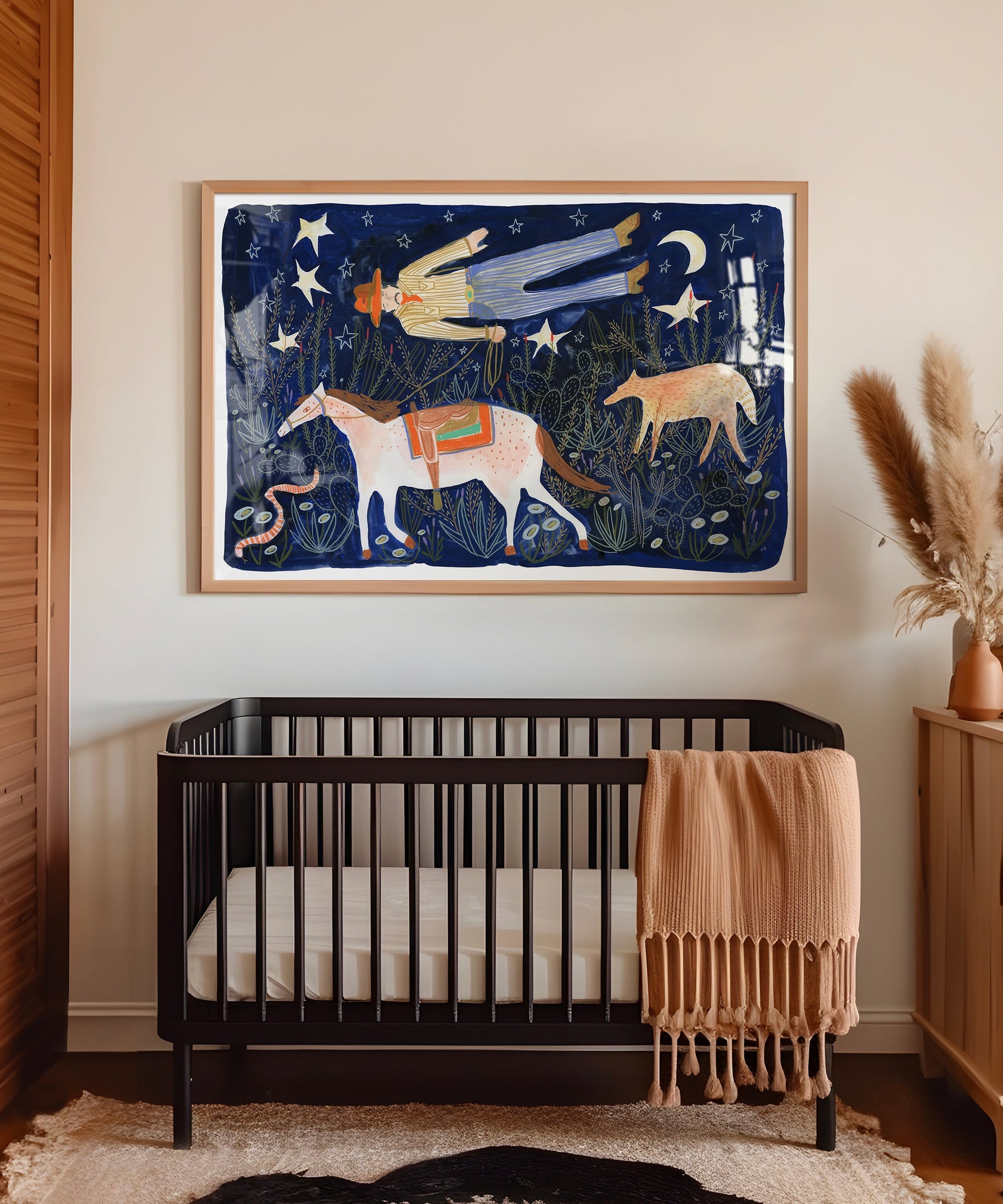 One of Melissa Lakey's most beloved pieces, this calming print is aptly entitled "Who's Dreaming Who." Featuring a dreaming cowboy floating above his horse, this piece pairs perfectly with its cowgirl counterpart print "Dream Journey". With its whimsical style, and calming colors, this print is sure to bring a soothing presence to any little one's space.