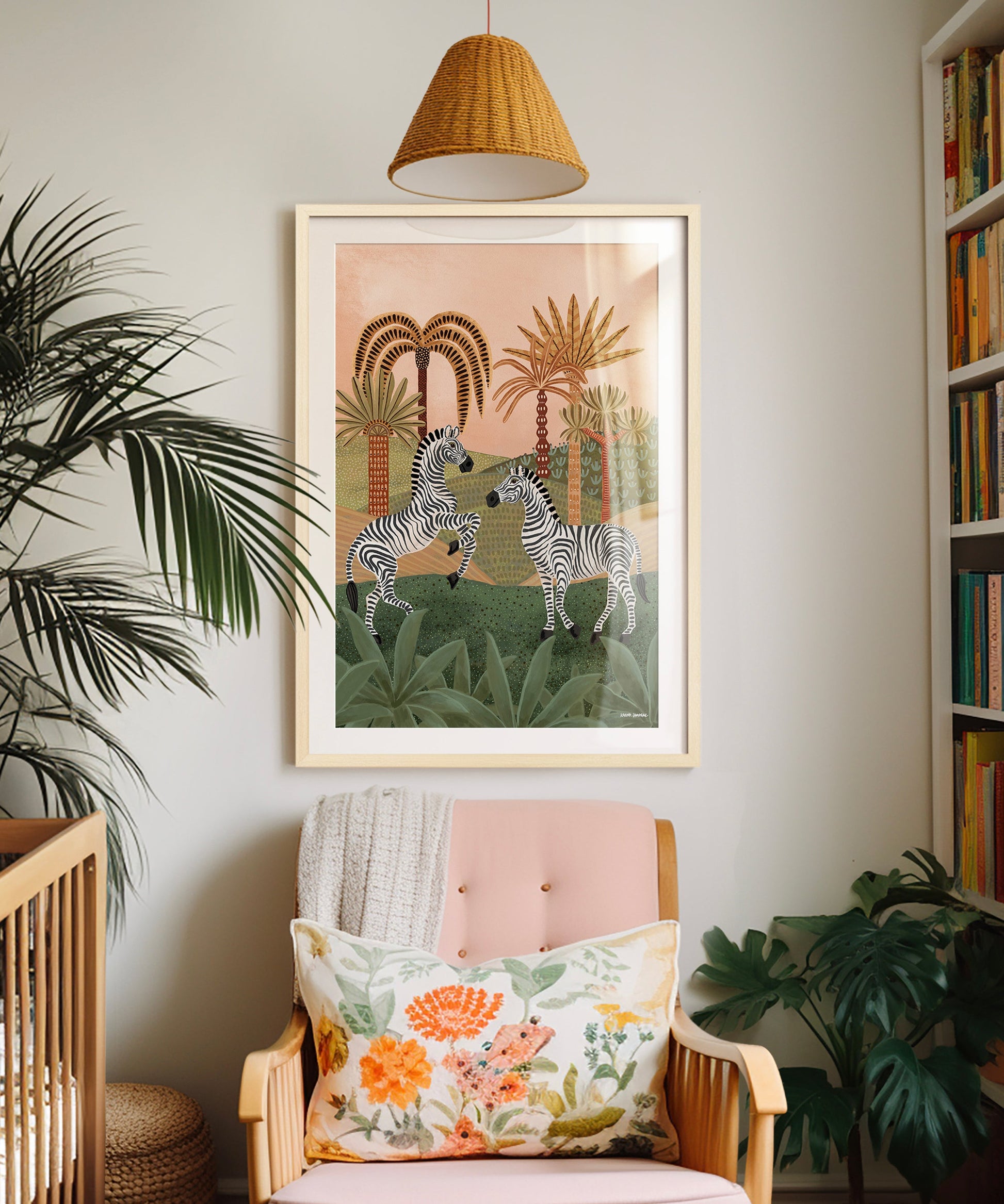 Artist Karina Jambrak invites you to step into a wild and wonderful world, where you'll find these two zebras playing under the palms. A master of natural hues and playful patterns, Karina showcases her signature style through the intricate stripes of these majestic beasts. A must-have for any safari or jungle themed nursery, this piece adds a playful and calming touch to your little one's space.